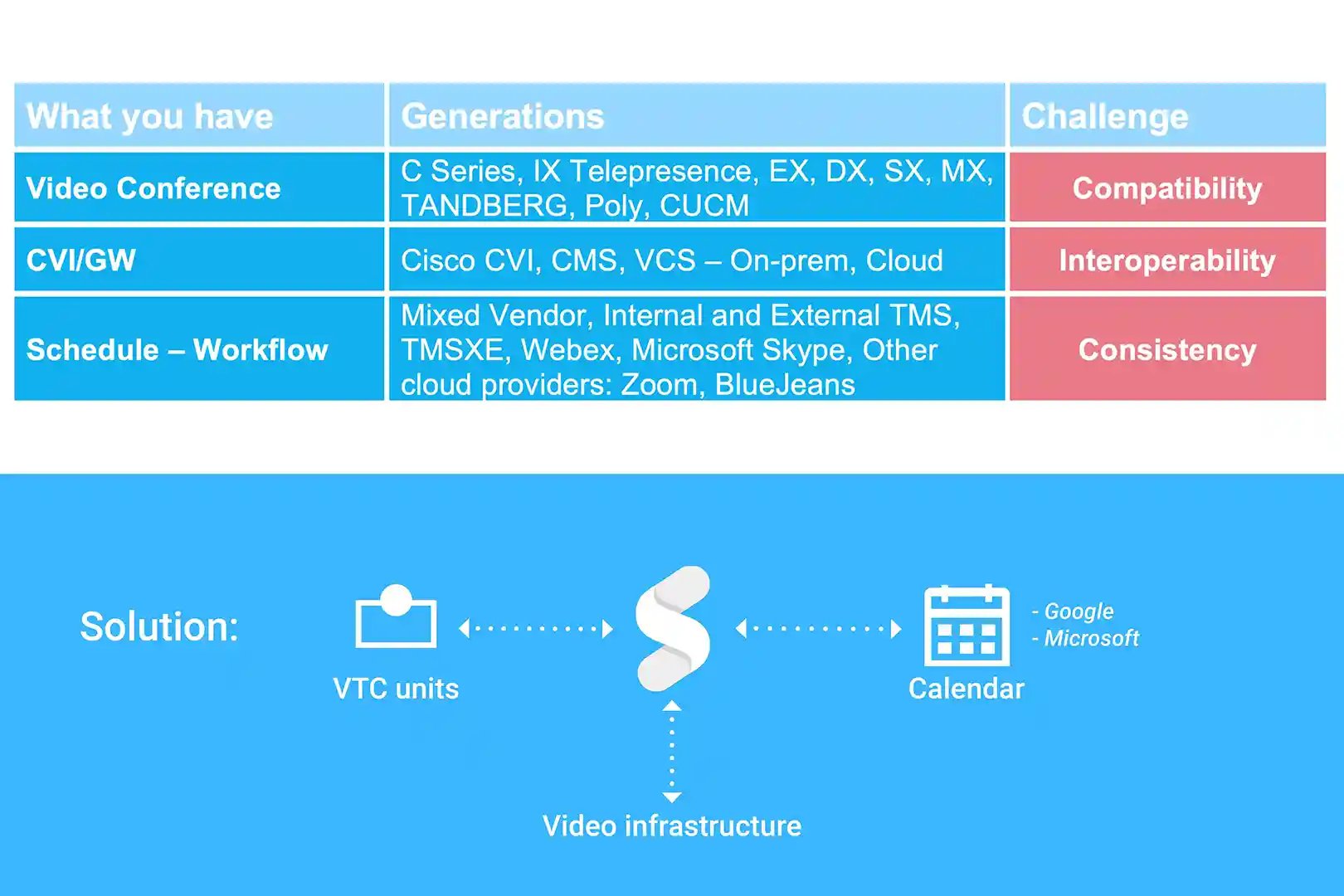 These challenges are not easy to fix. Especially if you find yourself in a technical environment filled with various generations of endpoints, conferencing platforms, and scheduling tools. Synergy SKY is vendor agnostic, we support your technologies for meetings.