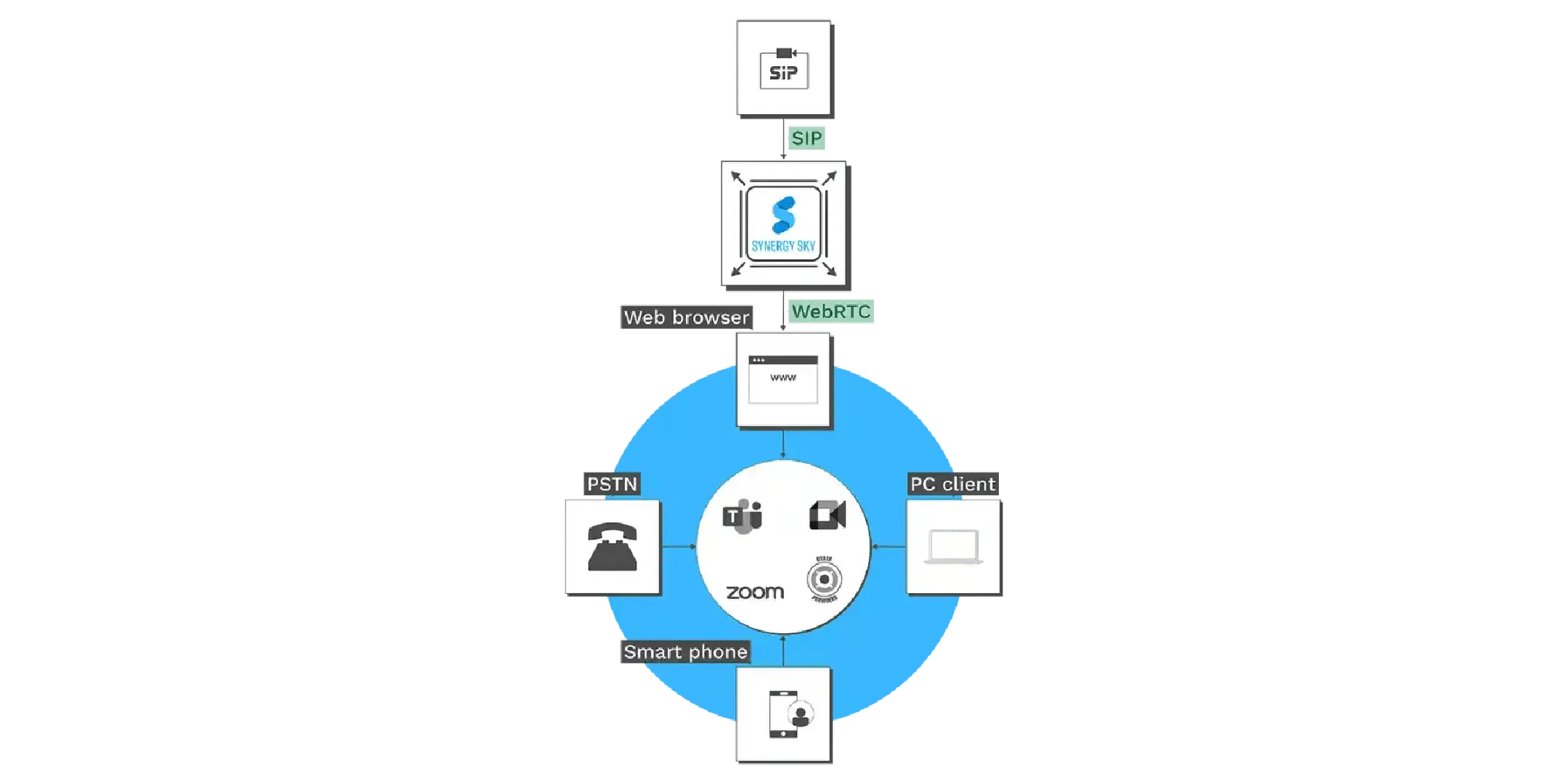 (See diagram above) Cloud meetings have four primary access points: web browser, PC client, smartphone, and PSTN. Synergy CONNECT leverages the web interface of these platforms to securely and reliably connect SIP devices — using a patented, standards-based approach